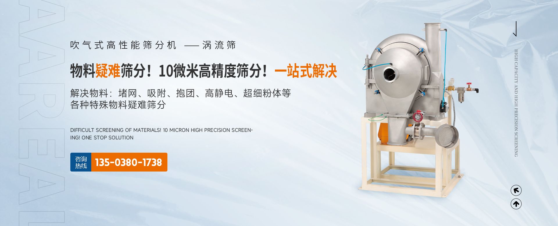 阿 瑞 爾(AAREAL)? 是從事篩分·過濾設備設計和制造的高新技術企業,擁有先進的生產設備、粉體篩分分析實驗室,在中國廣州市設辦事處。祝賀:新鄉市超大產能精細篩分技術工程中心在阿瑞爾(AAREAL)成立?。。≡诰€大產能篩分和在線動態過濾是阿 瑞 爾(AAREAL)?的產品特點■ 在線大產能篩分,突破了傳統篩分觀念,工業化篩分,實現大產能、高能效篩分。以低故障率、低停機率、低使用成本、高產能、高精度、高能效為您帶來巨大意外收益。■ 阿瑞爾(AAREAL)擁有的回轉篩分技術,擁有的近百種篩分解決方案及上千種物料的篩分經驗,會給您展現全新的篩分設備,幫您實現大產能篩分 高精度篩分 疑難篩分?!?阿瑞爾(AAREAL)的品質保證:阿 瑞 爾(AAREAL)? 是高品質篩分設備制造商高品質是阿 瑞 爾(AAREAL)? 質量準則。優品設備 合理篩分是阿 瑞 爾(AAREAL)?回報客戶的驗收標準?!覀儾坏珦碛邢冗M的生產設備,而且對于每一道工序,每一個細節,我們都要精工細作。對于客戶的每一個細微的問題,我們都要認真解決?!闹谱骱陀眯姆帐俏覀儗蛻舻呢熑?。阿瑞爾(AAREAL)是您成功道路上值得信賴的、合作伙伴,以良好的質量、經驗和服務享譽多個國家,確保您安心地選擇每一件產品,阿瑞爾(AAREAL)竭誠與國內外商家雙贏合作,共同發展,共創輝煌!阿瑞爾(AAREAL)——您正確的選擇。